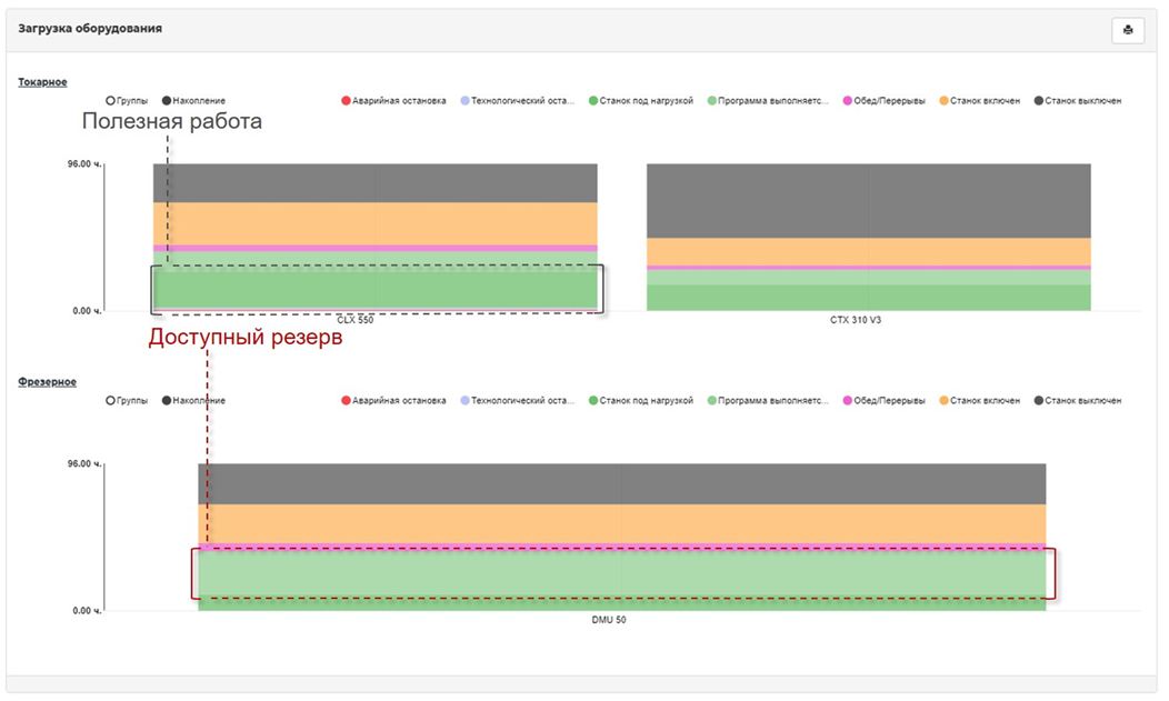 При рассмотрении эффективности работы оборудования – зачастую основной критерий, по которому производится контроль, это загрузка оборудования (сколько времени оборудование работает в «Цикле» - т.е. выполняют технологическую операцию). Внутри этого времени, суммарной загрузки оборудования находится один из самых главных критериев оценки работы оборудования – полезная работа. Именно внутри полезной работы оборудования и находится реальная эффективная работа.